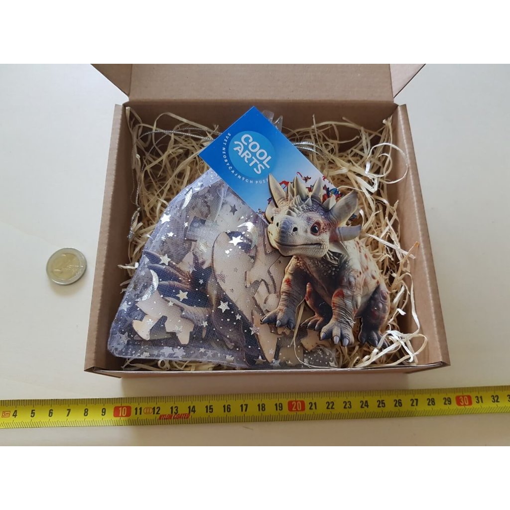 - samotné drevené puzzle dinosaurusa s jedinečne tvarovanými dielikmi balené vo vrecúšku a kartónovej krabičke,