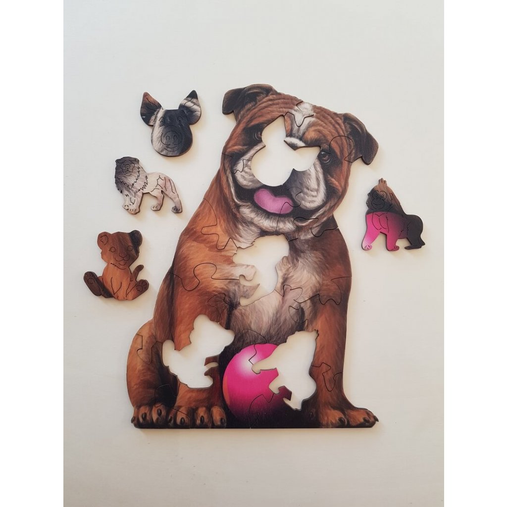 Poskladaj si Psa BullDoga z originálnych dielikov nášho unikátneho dreveného puzzle vyrobeného z brezového dreva na Slovensku. Drevená hračka je certifikovaná pre deti od 3 rokov. Deťom zaručujeme jedinečný zážitok pri skladaní puzzle a nádherný výsledný obraz. Hotové umelecké dielo ktoré zabaví a nakopne jemnú motoriku, logické myslenie a predstavivosť.